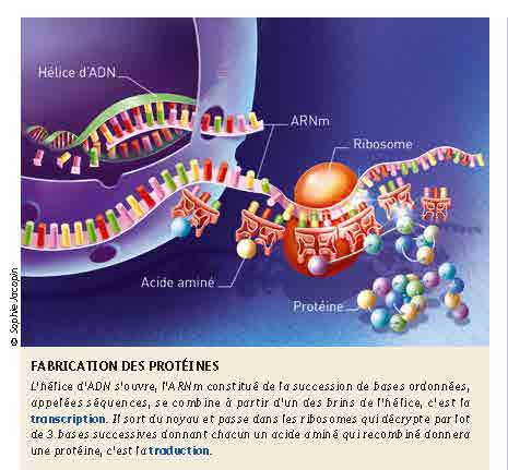 L’ADN (Acide DésoxyriboNucléique) qui se situe dans le noyau cellulaire est ensuite transcrit par des enzymes spécifiques en une molécule d’ARN (Acide RiboNucléique) spécifique qui est le messager de l’information génétique.